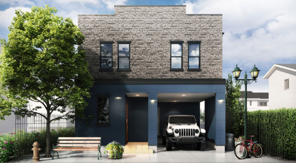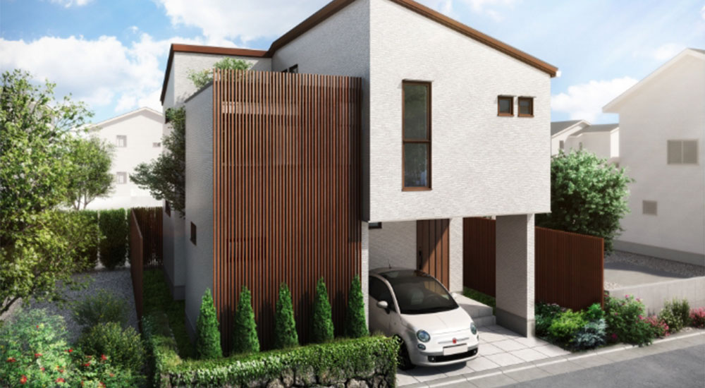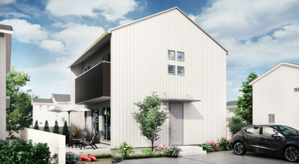 無機系素材の金属サイディングを使用し、ホワイト、グレー系でまとめた落ち着きのある外観が特徴です。都市型シンプルモダンデザインを採用した飽きのこないデザインは、どんな街並みともマッチします。