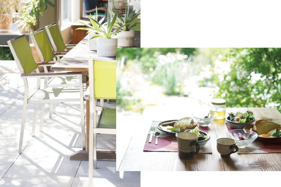 リビングにつながる広いルーフバルコニーも絶好のアウトドアスペース。キッチンから料理を運んで家族や友人とパーティーを楽しむこともできます。中庭のシンボルツリーは家族みんなで植えた記念樹。クリスマスにはイルミネーションツリーに早変わり。