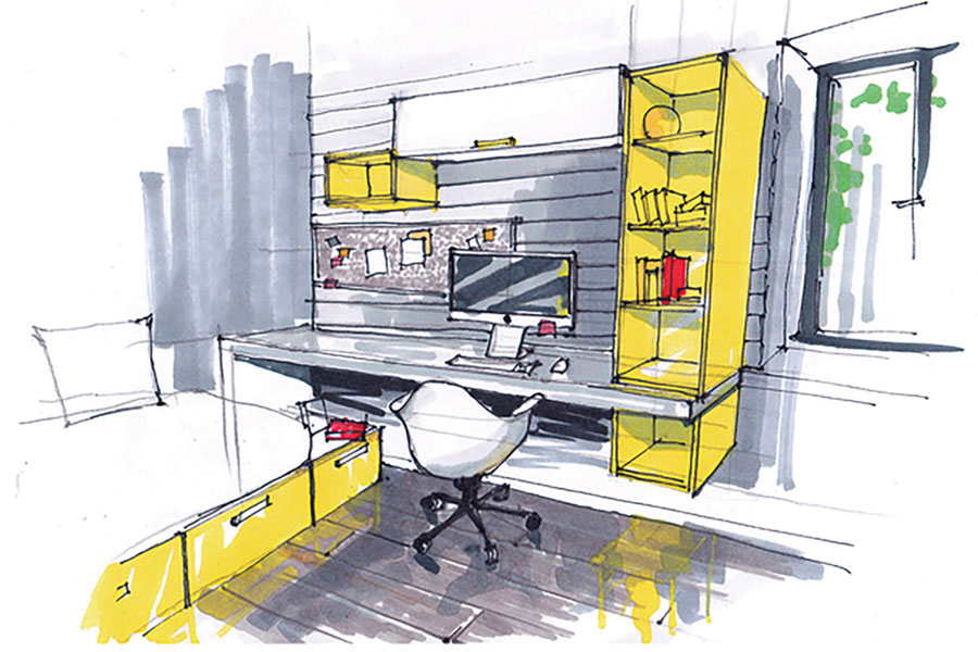 2階のスタディコーナーは、吹き抜けを利用した明るく快適な空間です。子どもの勉強場所としてはもちろん、仕事や趣味などにも幅広く使うことができます。キッチンの真上にあり、家事の最中でも吹き抜けを通じて勉強中の子どもの様子がわかるので安心です。