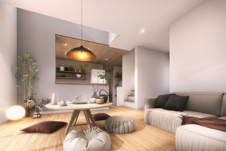 「和」の雰囲気を生かしながらもモダンデザインとの融合によって、個性的で洗練された印象に。床座を暮らしの中心に取り入れた住まいはコンパクトでも開放感があるのが特徴。リラックスした空間で家族の時間を楽しむことができます。