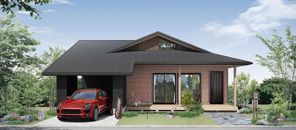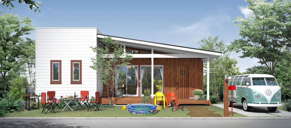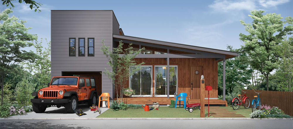 アメリカの平屋住宅をモチーフに、1.5寸の緩勾配の屋根が、現代の子育て世代にびったリのシンプルナチュラルなテイストを表現。北米の住宅によく見られる「フロントポーチ」からリピングにつながる部分が「タイル仕上げ」になっており、屋外と屋内の空間をひと続きのように楽しめる「プラスα」の価値を生み出すデザインが魅力です。