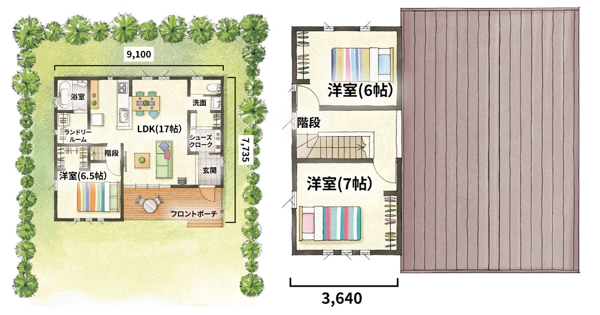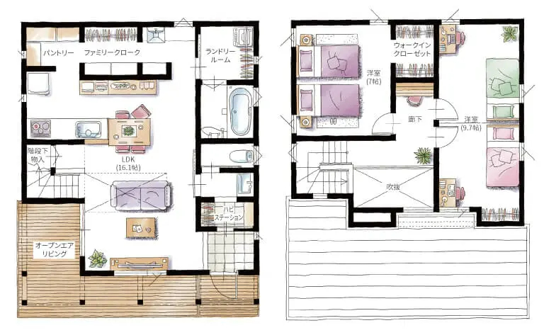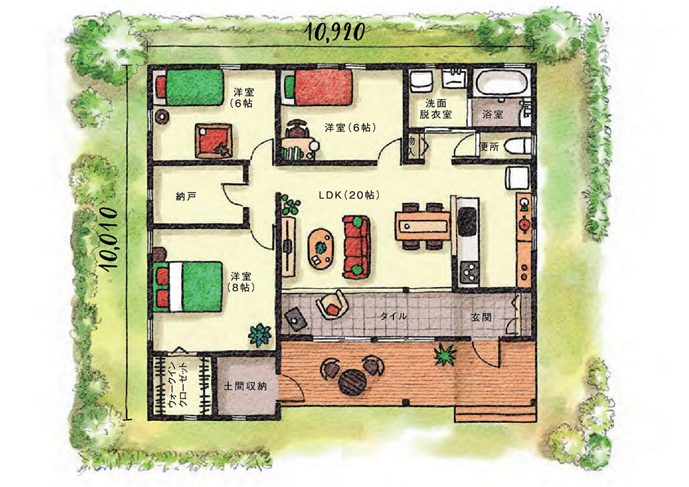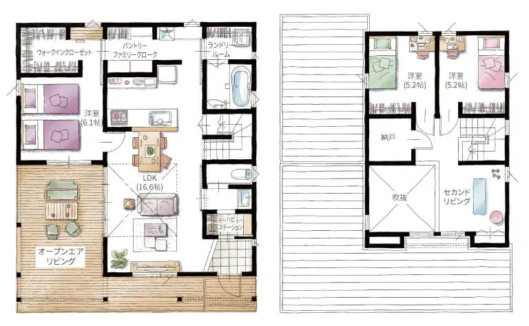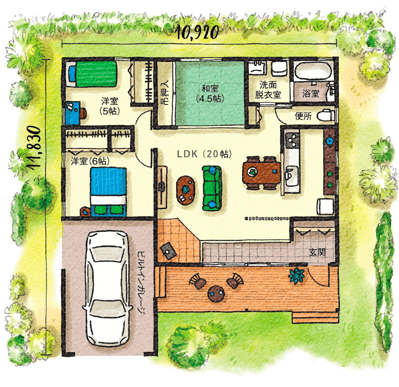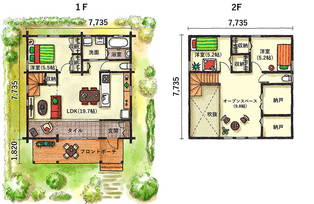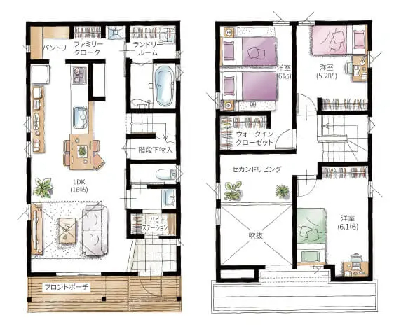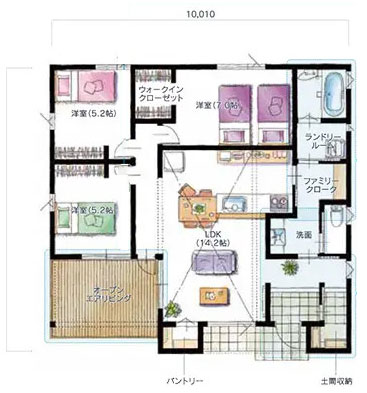 生活空間が同じフロアに集約されているので、使い勝手が良く家事もスムーズ。それぞれの部屋から、すぐにリビングやダイニングにつながれるので家族同士のコミュニケーションもとりやすいのが特徴の平屋タイプ。さらに、フロントポーチが内と外をひと続きにするデザインで、敷地面積以上の解放感を生み出しています。
