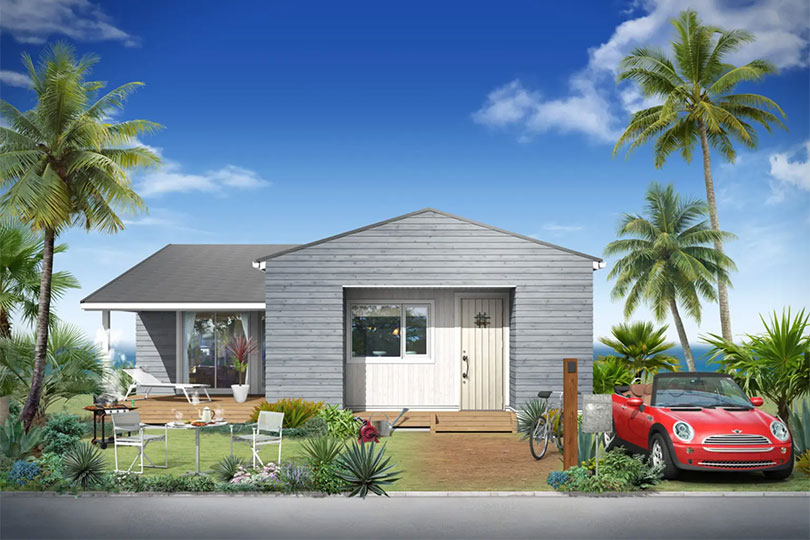 ハックベース“ベレー”のシンプルでナチュラルなテイストと、屋外と屋内の空間をひと続きのように楽しめるデザインはそのままに、ビルトインガレージを組み込んだタイプです。