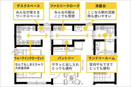「洗濯・乾燥・→たたむ→収納」を一か所に集約。キッチンやリビングへもぐるっと回れる動線なので家事の効率も高まります。